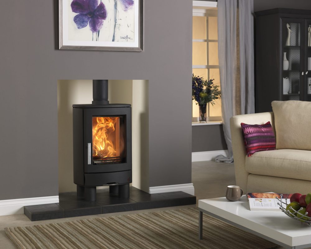 Fitted with 4 short cylindrical legs, the ACR Neo 1F wood burning stove is ideal for installing into a fireplace recess as well as free standing installations.