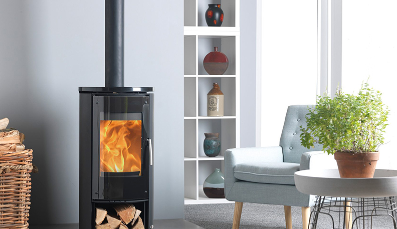 The freestanding, cylindrical Novus is finished in matt black with a contrasting gloss black ceramic top panel and a full door height glass door. There’s a handy logstore below the firebox and the stove is suitable to sit on a 12mm hearth. This easy to maintain stove is ideal for modern airtight homes and has an optional air kit to take combustion air from outside the property with no draughts.